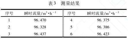 爲驗(yan)證流量(liang)計穩定(ding)性,在實(shi)驗平台(tai)正常工(gong)作的情(qing)況下調(diao)節流💋速(su),使得平(ping)均流量(liang)在96m3/h的前(qian)提下連(lian)續采集(ji)6組瞬時(shi)流量數(shu)據,所測(ce)結果如(ru)表3所示(shi)。