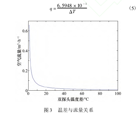 如上(shang)所示,量(liang)程範圍(wei)受最大(da)電流限(xian)制。想要(yao)拓寬量(liang)程,不妨(fang)将兩種(zhong)方法相(xiang)結合。在(zai)速度探(tan)頭的電(dian)流達到(dao)0.09A之前采(cai)用恒👅溫(wen)差法進(jin)行測量(liang),在0.09A之後(hou)采取恒(heng)功率法(fa)進行測(ce)量。0.09A時速(su)度🏃♂️探頭(tou)功耗爲(wei)0.237W,以此功(gong)耗爲恒(heng)定功耗(hao),流🔞過速(su)度探頭(tou)的流量(liang)與溫度(du)差之間(jian)的關系(xi)如式(5)和(he)圖3所示(shi),對于溫(wen)差爲50~100℃時(shi)具有❄️較(jiao)好的靈(ling)敏🐕度。溫(wen)差爲50℃時(shi),此時速(su)度探頭(tou)支路電(dian)流爲0.096A,小(xiao)于最大(da)電流,所(suo)測流量(liang)爲1.31869×10-2m3/h。