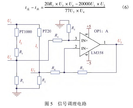 信(xin)号調理(li)電路如(ru)圖5所示(shi),信号調(diao)理電路(lu)相鄰兩(liang)端爲PT20和(he)PT1000,另⛱️外兩(liang)端電阻(zu)爲20Ω的電(dian)阻R2和1kΩ的(de)電阻R1,在(zai)PT1000電阻一(yi)端有補(bu)償電阻(zu)R3,R1和R2兩端(duan)的電勢(shi)差經差(cha)分放大(da)後爲U2。差(cha)分放🏃大(da)電路中(zhong)R4=R6,R5=R7。可調直(zhi)流電源(yuan)提供電(dian)壓U1。無任(ren)何氣體(ti)流過時(shi),速度探(tan)頭的溫(wen)度比溫(wen)度探🚶♀️頭(tou)高100℃,補償(chang)電阻R3保(bao)證電🏃♂️橋(qiao)平衡,此(ci)時電勢(shi)差U2爲0,電(dian)勢差U2由(you)AD7066芯片進(jin)行采集(ji)。R1、R2兩⚽端電(dian)壓U3、U4由AD7066采(cai)集後,除(chu)去阻值(zhi)即可得(de)到速度(du)探頭和(he)溫度💔探(tan)頭支路(lu)電流I1和(he)I2。若I1值小(xiao)于0.09A,采用(yong)恒溫差(cha)法,根據(ju)I1值求得(de)流量。當(dang)進氣流(liu)量增大(da)時,速度(du)探頭發(fa)生熱對(dui)流,被氣(qi)體帶走(zou)一部分(fen)熱量,溫(wen)度降低(di),阻值減(jian)小,電🌈橋(qiao)平衡被(bei)打破。控(kong)制電路(lu)根據電(dian)勢差U2增(zeng)大U1輸入(ru),I1增大使(shi)得速度(du)探頭功(gong)耗增大(da),溫度🌐上(shang)升,阻值(zhi)上升,電(dian)橋重新(xin)平衡;而(er)當進氣(qi)流量減(jian)小,速度(du)探頭溫(wen)度升高(gao),阻值增(zeng)加,則減(jian)小U1輸🏃🏻♂️入(ru),減小I1,減(jian)小速度(du)探頭功(gong)耗,速度(du)探頭溫(wen)度降低(di),阻值減(jian)小,電橋(qiao)重新平(ping)衡。若I1值(zhi)大于0.09A,采(cai)用恒功(gong)率法進(jin)行測量(liang),根據溫(wen)度差求(qiu)得流量(liang)。進氣流(liu)量增大(da),速度探(tan)頭溫度(du)降低,阻(zu)值減小(xiao),功耗增(zeng)大,減小(xiao)U1輸入,使(shi)得速度(du)探頭💛功(gong)耗維持(chi)定值;進(jin)氣流量(liang)減小,速(su)度探🈲頭(tou)溫度⭐升(sheng)高,阻值(zhi)增大,功(gong)耗減小(xiao),增大U1輸(shu)入,使得(de)速度探(tan)頭功耗(hao)🈲維持定(ding)值。溫度(du)差公式(shi)如式(6)所(suo)示。