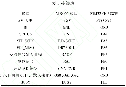 控(kong)制電路(lu)以STM32F103C8T6爲核(he)心組成(cheng)最小系(xi)統,引出(chu)足夠的(de)I/O口以作(zuo)拓展。因(yin)爲信号(hao)調理電(dian)路輸出(chu)的電勢(shi)差U2具有(you)正負極(ji)性,所以(yi)STM32F103C8T6自帶AD采(cai)集無法(fa)滿足要(yao)求,選用(yong)AD7066芯片進(jin)行采🌐集(ji)。AD7066自帶♻️數(shu)字濾✊波(bo)器,有8個(ge)采集通(tong)道,支持(chi)真正±10V或(huo)±5V的雙極(ji)性信号(hao)輸入電(dian)流。AD7066有并(bing)口接線(xian)和SPI串口(kou)🙇♀️接線兩(liang)種接線(xian)方式,此(ci)處采用(yong)SPI串口接(jie)🙇♀️線。STM32最小(xiao)系統與(yu)AD7066之間的(de)接線如(ru)表1所示(shi)。AD7066的V1~V4口分(fen)别采集(ji)U1~U4的電壓(ya)值。STM32通過(guo)對電位(wei)器X9111的RL控(kong)制改變(bian)電源輸(shu)出電壓(ya)大小。STM32的(de)PB13口接X9111的(de)SCK口,PB14口接(jie)X9111的SO口㊙️,PB15口(kou)接SI口。