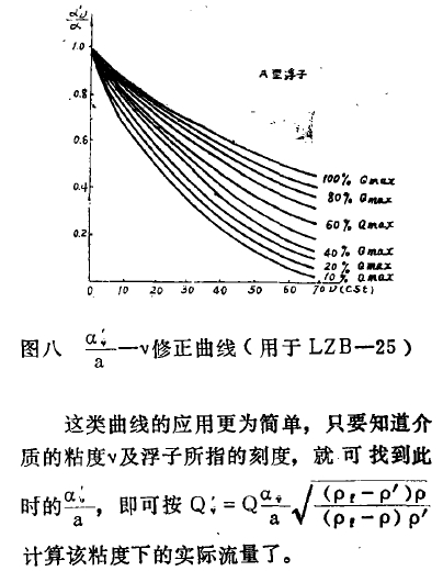 變,由于(yu)橫座标(biao)不用Re而(er)用v,因此(ci)流體的(de)流速或(huo)者說❌流(liu)體流量(liang)的影響(xiang)和粘度(du)的影響(xiang)及口徑(jing)的影響(xiang),已不能(neng)用單-的(de)參量來(lai)表示。爲(wei)此,在描(miao)繪曲線(xian)時,必須(xu)考慮不(bu)同口徑(jing)和不同(tong)的流量(liang)下(或者(zhe)說浮子(zi)在不同(tong)的位置(zhi))av/a--v的修正(zheng)情況,這(zhe)類修正(zheng)曲線的(de)描繪如(ru)八所示(shi)。