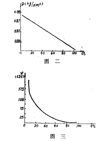 30#機(ji)油的ρ(密(mi)度)一t℃(溫(wen)度)及v(運(yun)動學粘(zhan)度)-t℃的曲(qu)線分别(bie)見圖二(er)、圖三。