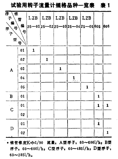 - 試(shi)驗用轉(zhuan)子流量(liang)計的規(gui)格品種(zhong)見表1。