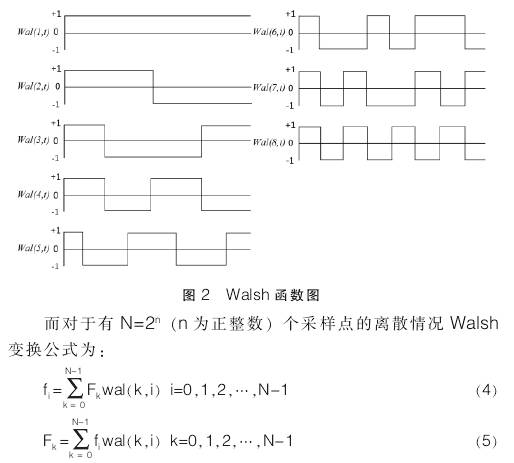 Walsh(沃爾(er)什)函(han)數是(shi)[O,1]定義(yi)在上(shang)完備(bei)、歸一(yi)化的(de)正交(jiao)系,記(ji)爲wal(n,k),具(ju)體波(bo)形如(ru)圖2所(suo)示。其(qi)中k爲(wei)自變(bian)量,n爲(wei)序率(lü),表示(shi)Walsh函數(shu)在[0,1]間(jian)變号(hao)的次(ci)數,Walsh函(han)數的(de)矩形(xing)波幅(fu)值的(de)取值(zhi)爲+1或(huo)-1。