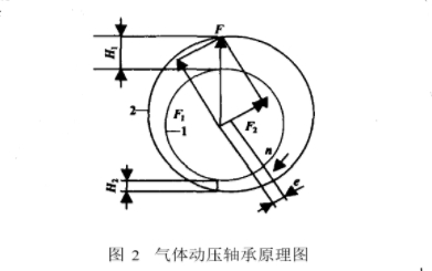 如圖2所(suo)示,旋轉(zhuan)件1受載(zai)後将與(yu)固定件(jian)2産生偏(pian)心。當旋(xuan)轉件1以(yi)轉速n運(yun)動時,其(qi)間隙爲(wei)和H,且H1>H2過(guo)濾後的(de)氣體從(cong)H流向H2氣(qi)體在楔(xie)形間隙(xi)中形成(cheng)壓力F1。氣(qi)體是可(ke)壓縮的(de),在間隙(xi)H2處形成(cheng)低壓區(qu),結果在(zai)偏心方(fang)向也産(chan)生支承(cheng)力F2則總(zong)支承力(li)F爲矢量(liang)相加即(ji)