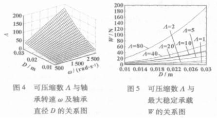 根據(ju)最大穩(wen)定承載(zai)w=εW/(εp,LD)=7.5X104D2W/Ɛ,通過對(dui)表1的分(fen)析,同樣(yang)利用MAILAB軟(ruan)件分析(xi)最大穩(wen)定承載(zai)w與參數(shu)徑向承(cheng)載w/ε以及(ji)軸承直(zhi)徑D的相(xiang)互關系(xi),可以得(de)到圖5。