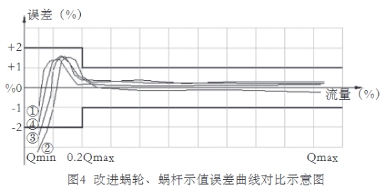 針(zhen)對流量(liang)計傳動(dong)的特點(dian),将渦輪(lun)厚度變(bian)薄,減少(shao)渦杆、渦(wo)輪配合(he)時的接(jie)觸長度(du),如圖3(b),經(jing)過試驗(yan),小流量(liang)段示值(zhi)誤差明(ming)顯改☀️善(shan),如⭐圖4示(shi)值誤差(cha)曲線③。但(dan)流量計(ji)穩定性(xing)差,重複(fu)性難以(yi)保證。