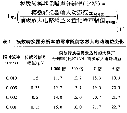 電(dian)磁流量(liang)傳感器(qi)的響應(ying)通常爲(wei)150 μV/( m/s)到200μV/(m/s),因爲(wei)調制勵(li)磁電流(liu)的換向(xiang),傳感器(qi)的輸出(chu)信号幅(fu)值加倍(bei)。以150 μV/( m/s)(300 μV峰峰(feng)值)響應(ying)爲例,對(dui)0.3~15 m/s流速㊙️的(de)量程範(fan)圍,傳感(gan)器輸出(chu)信号幅(fu)值在90 μV峰(feng)峰值到(dao)4.5 mV峰峰值(zhi)之間。保(bao)證流速(su)信号被(bei)模數轉(zhuan)換器正(zheng)确分辨(bian)的最低(di)要⭐求是(shi)出現在(zai)模數轉(zhuan)換器輸(shu)人端的(de)傳感器(qi)信号幅(fu)值不得(de)大于模(mo)數轉換(huan)器噪聲(sheng)的一半(ban)。模數轉(zhuan)換器無(wu)噪聲分(fen)辨率✏️的(de)計算公(gong)式如式(shi)(1)所示。瞬(shun)時流速(su)對應的(de)傳感器(qi)信号幅(fu)值可被(bei)當作對(dui)模數轉(zhuan)換器噪(zao)聲的最(zui)👣低要求(qiu)。由表1可(ke)見前級(ji)放大電(dian)路增益(yi)越低對(dui)模數轉(zhuan)換器🍉的(de)無⛹🏻♀️噪聲(sheng)分辨率(lü)指标的(de)要求越(yue)高。這是(shi)20世紀後(hou)期數十(shi)年裏在(zai)缺少成(cheng)本可負(fu)擔、高👄分(fen)辨率的(de)模數轉(zhuan)換器的(de)條件下(xia),