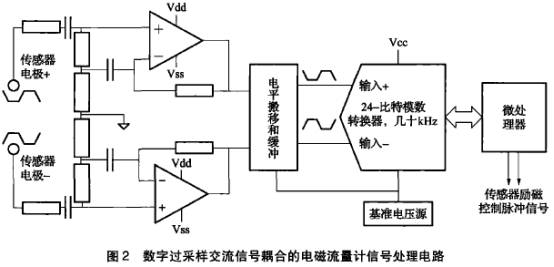 電子(zi)進步使(shi)得在本(ben)世紀初(chu)開始出(chu)現越來(lai)越多性(xing)🛀價比更(geng)🥵好的低(di)噪聲24比(bi)特模數(shu)轉換器(qi)産品。随(sui)之出現(xian)的數字(zi)過采樣(yang)交流信(xin)号耦合(he)放大是(shi)一種改(gai)進的電(dian)路結構(gou)。如圖2所(suo)示傳感(gan)器電極(ji)輸出信(xin)号使用(yong)電容耦(ou)合,在前(qian)置放大(da)級采用(yong)自舉電(dian)路🤞提高(gao)輸人👅阻(zu)抗,真差(cha)分輸出(chu)到模數(shu)🤟轉換器(qi)。省略📱模(mo)拟帶通(tong)放大、采(cai)樣保持(chi)等電路(lu)。較高速(su)的模數(shu)轉換器(qi)對前置(zhi)放大器(qi)的輸出(chu)做過采(cai)樣。微處(chu)理器在(zai)數字域(yu)内重建(jian)流速信(xin)号波形(xing)、同😍步解(jie)調交流(liu)信号、濾(lü)除尖峰(feng)和噪聲(sheng),計算流(liu)速信号(hao)。該電路(lu)與前一(yi)-種電路(lu)相比的(de)優點是(shi):更少的(de)元💃件,更(geng)低的價(jia)格,真差(cha)分信号(hao)的抗🌂幹(gan)擾,接受(shou)較寬的(de)輸人共(gong)模電壓(ya)範圍。