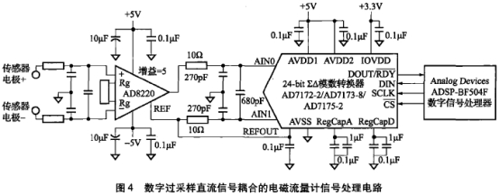本文(wen)電磁流(liu)量轉換(huan)器信号(hao)處理電(dian)路如圖(tu)4所示。電(dian)磁流量(liang)傳感器(qi)的一對(dui)電極輸(shu)出經過(guo)射頻濾(lü)波阻容(rong)網🎯絡直(zhi)💁流耦合(he)至±5V供電(dian)的AD8220結型(xing)場效應(ying)管輸入(ru)儀表放(fang)大器輸(shu)入端。AD8220的(de)增益設(she)置爲5倍(bei),參考電(dian)平管腳(jiao)✨連接到(dao)AD7172-2模數轉(zhuan)換器的(de)2.5 V内部基(ji)準源輸(shu)出🌈,把儀(yi)放輸🈲出(chu)信号的(de)電平擡(tai)高至正(zheng)極性。被(bei)AD8220調理後(hou)的傳感(gan)器♈信号(hao)直流耦(ou)合至+5 V供(gong)電的AD7172-2第(di)0号🙇♀️輸人(ren)通道,AD7172-2的(de)2.5V内部基(ji)準源輸(shu)出接第(di)1号📧輸人(ren)通道,兩(liang)個通🏒道(dao)組成0~5 V僞(wei)差分輸(shu)人。AD7172-2 的輸(shu)出數據(ju)率設爲(wei)31 250 Hz ,數字量(liang)化後的(de)樣點送(song)入ADSP-BF504F數字(zi)信号處(chu)理器進(jin)行同步(bu)解調數(shu)字濾波(bo)和流量(liang)計算、線(xian)性化補(bu)償、電流(liu)或脈沖(chong)輸出等(deng)處理。該(gai)方案試(shi)圖吸取(qu)數字過(guo)采樣交(jiao)流信号(hao)耦合的(de)電磁流(liu)量計信(xin)号放大(da)電路優(you)點的🔞同(tong)時避免(mian)其共模(mo)抑制比(bi)損失的(de)缺點。通(tong)過使用(yong)比傳統(tong)方🙇♀️案低(di)🥰一到二(er)百倍的(de)模拟增(zeng)益并結(jie)合🌈軟件(jian)的方法(fa)解決直(zhi)流耦合(he)帶來的(de)信号飽(bao)和問題(ti)。因爲放(fang)大器增(zeng)益❓隻有(you)5倍, ±5 V供電(dian)的AD8220的軌(gui)到軌電(dian)壓輸出(chu)範圍的(de)上限是(shi)4.8V,單🛀🏻5V供電(dian)且集成(cheng)真軌到(dao)軌輸人(ren)緩沖器(qi)的AD7172-2的輸(shu)人電壓(ya)範圍是(shi)0~5 V。所㊙️以放(fang)大器輸(shu)人動态(tai)範圍等(deng)于(4.8-2.5) +5=0.46(V),折合(he)🤟150 μV/(m/s)響應的(de)傳😄感器(qi)在3 067 m/s流速(su)的輸出(chu)(這僅是(shi)理論值(zhi),實際流(liu)速不可(ke)能這🏒麽(me)高)。這表(biao)明該電(dian)路設計(ji)能夠處(chu)理極寬(kuan)廣的流(liu)速範圍(wei)。該電路(lu)的非線(xian)性誤差(cha)由儀表(biao)放大器(qi)和模數(shu)轉換器(qi)的非線(xian)性低指(zhi)标共同(tong)決定。AD8220和(he)AD7172-2的💚數據(ju)手冊标(biao)稱其非(fei)線性誤(wu)差典型(xing)值分别(bie)是5PPM和✂️±2PMM,所(suo)以該電(dian)路🌈設計(ji)具💋有♈線(xian)性佳。
